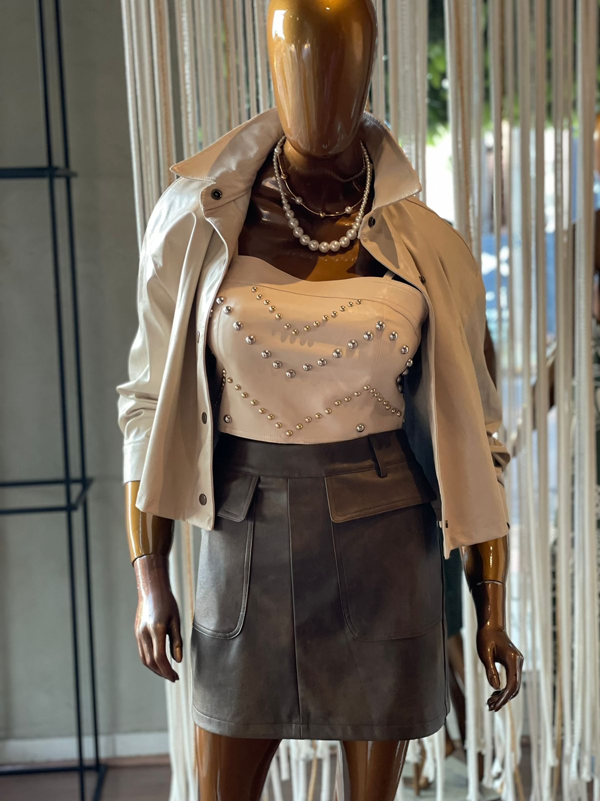 Cropped couro p.u com detalhes em spike, com fechamento em botão de pressão e ziper nas costas.