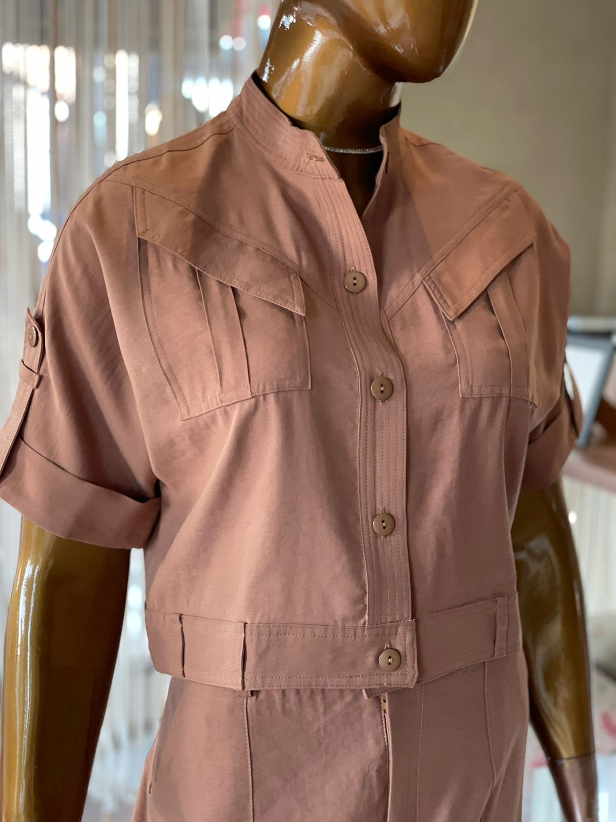 Jaqueta Marilia manga curta e com detalhes, fechamento em botões, bolsos fontais, passantes na barra.